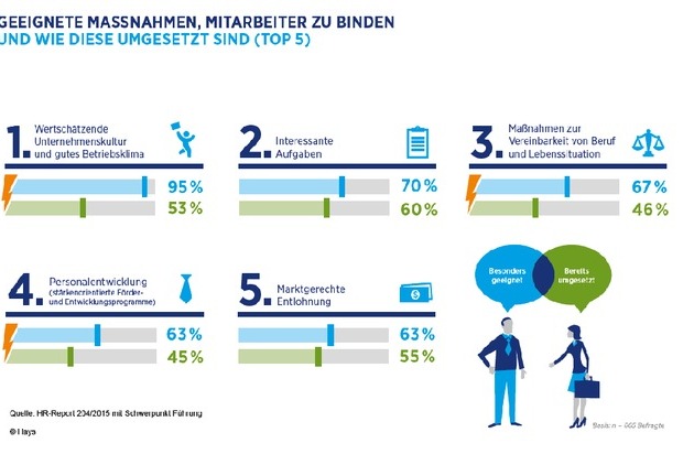 Besonders gut eignet sich eine wertschätzende Unternehmenskultur bzw. ein gutes Betriebsklima, um Mitarbeiter zu binden. Das sagen 95 Prozent der Befragten, aber gleichzeitig meinen nur 53 Prozent, dass dies bereits umgesetzt sei. Je nach Position variieren hier die Wahrnehmungen: Während 73 Prozent der befragten Unternehmensleiter meinen, eine wertschätzende Unternehmenskultur existiere bereits, stimmen dem nur 41 Prozent der Mitarbeiter ohne Führungsverantwortung zu.