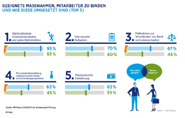 Mitarbeiter zu binden, ist für Führungskräfte in Unternehmen von zentraler Bedeutung. So sprechen im aktuellen HR-Report 61 Prozent der Befragten der Mitarbeiterbindung eine sehr hohe bzw. hohe Bedeutung zu. Beim Topmanagement sind es sogar 78 Prozent. Dennoch ergreifen Unternehmen immer noch viel zu wenige geeignete Maßnahmen, um ihre Mitarbeiter zu halten. Die Diskrepanz zwischen Anspruch und Wirklichkeit existiert daher weiterhin, wie der HR-Report 2014/2015 aufzeigt. Für ihn befragten das Institut für Beschäftigung und Employability (IBE) und der Personaldienstleister Hays 665 Entscheider und Mitarbeiter aus Unternehmen.