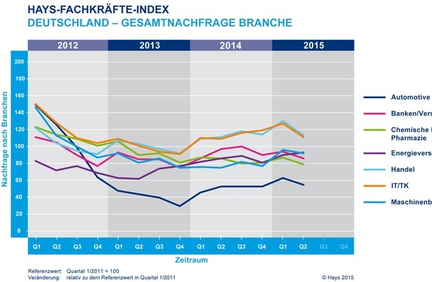 Insgesamt verlor der Hays-Fachkräfte-Index sieben Punkte und steht nun bei 98 Punkten. Den Referenzwert von 100 bildet das 1. Quartal 2011. Der Index basiert auf einer quartalsweisen Auswertung aller relevanten Stellenanzeigen in regionalen und überregionalen Tageszeitungen sowie den meistfrequentierten Online-Jobbörsen.