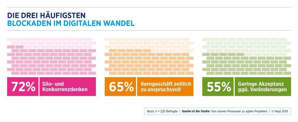 Für die Studie "Von starren Prozessen zu agilen Projekten - Unternehmen in der digitalen Transformation" wurden insgesamt 225 Entscheider aus IT, Finanzwesen sowie Forschung und Entwicklung bzw. Produktionsplanung aus mittleren und großen Unternehmen telefonisch zwischen März und Mai 2015 interviewt. Alle Studienergebnisse stehen als Download unter hays.de/studien bereit.