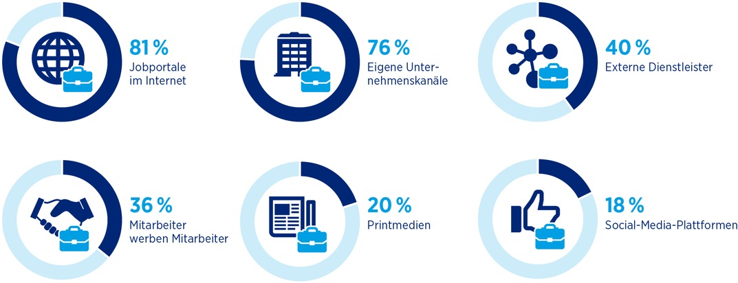 Auch die weltweite Suche spielt eine vergleichsweise marginale Rolle. Ungeachtet der hohen Bedeutung der chinesischen, amerikanischen und indischen Märkte, finden nur vier bis sechs Prozent der befragten Unternehmen neue Mitarbeiter in diesen Ländern. Die Ergebnisse des HR-Reports zeigen jedoch, dass Industrieunternehmen viel häufiger (40 %) im Ausland rekrutieren, als Dienstleister (11 %). Bei Unternehmen, die Services bieten, spielen die Landessprache und -kultur bei der Mitarbeitersuche naturgemäß eine wesentlich wichtigere Rolle.