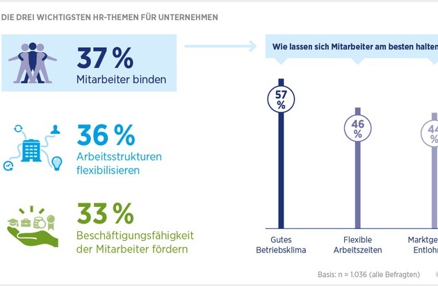 "Durch den Druck, den die demografische Entwicklung, die Digitalisierung und der Fachkräftemangel entfachen, nimmt der Kampf um Mitarbeiter deutlich zu. Daher liegt die Mitarbeiterbindung ganz oben und es gilt, den Mitarbeitern mehr Flexibilität einzuräumen. Durch die zunehmende Veränderungsgeschwindigkeit ist es zudem ein Gebot der Stunde, Mitarbeiter beschäftigungsfähig zu halten", erklärt Prof. Dr. Jutta Rump, Direktorin des IBE, das Ranking.