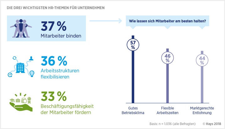 Trotz oder gerade wegen des Hypes um digitale und agile Organisationen: Mitarbeiter zu halten ist das Top-HR-Thema für 2018. Auf Platz 2 der HR-Agenda in Unternehmen liegt die Flexibilisierung der Arbeitsstrukturen. Die Beschäftigungsfähigkeit der Mitarbeiter zu fördern ist erstmals der drittwichtigste Punkt unter den HR-Themen. Dies zeigen die Ergebnisse des HR-Reports 2018, den Hays und das Institut für Beschäftigung und Employability (IBE) nun veröffentlicht haben. Befragt wurden über 1.000 Personen aus Unternehmen und Organisationen.