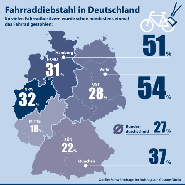 Ähm, gerade stand mein Rad doch noch hier!? - Diese Schrecksekunde haben unzählige Radfahrer schon erlebt. Mehr als ein Viertel der Bundesbürger (27 Prozent) wurde bereits einmal Opfer eines Fahrraddiebstahls. Besonders im Norden Deutschlands (31 Prozent) und in Nordrhein-Westfalen (32 Prozent) geben mehr Radfahrer als im Bundesdurchschnitt an, mindestens einmal bestohlen worden zu sein. Das ergab jetzt eine repräsentative forsa-Studie im Auftrag von CosmosDirekt.(1) Nicht überraschend: In den Metropolen ist die Diebstahlrate am höchsten. So wurde etwa in Berlin (54 Prozent) und Hamburg (51 Prozent) gut jedem Zweiten schon mal das Rad gestohlen.