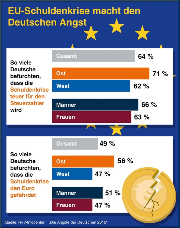 "Den nach finanzieller Sicherheit strebenden Deutschen sitzt die Angst ums liebe Geld seit jeher im Nacken", so Professor Dr. Manfred G. Schmidt, Politologe an der Ruprecht-Karls-Universität Heidelberg und Berater des R+V-Infocenters. Die in diesem Jahr größte Angst offenbart eine Sonderbefragung zur EU-Schuldenkrise, die das R+V-Infocenter seit fünf Jahren durchführt. "Fast zwei Drittel der Befragten befürchten, dass sie für die wirtschafts- und finanzpolitischen Sünden von EU-Mitgliedstaaten geradestehen müssen, die in schweren Refinanzierungskrisen stecken", so Professor Schmidt. Die Angst davor, dass die deutschen Steuerzahler die Kosten der Schuldenkrise in der Eurozone in überproportionalem Umfang schultern müssen, ist um 4 Prozentpunkte auf 64 Prozent gestiegen - und damit die mit Abstand größte Sorge 2015. Fast jeder Zweite (49 Prozent; Vorjahr: 45 Prozent) befürchtet obendrein, dass der Euro als Währung gefährdet ist. Hingegen ist die Furcht vor steigenden Lebenshaltungskosten - in den vergangenen 23 Jahren 15 Mal auf Platz 1 im Ängste-Ranking - am stärksten gesunken, nämlich um ganze 10 Prozentpunkte. Jetzt liegt sie mit 48 Prozent nur noch auf Platz 5 bei den Standardfragen der Ängste-Studie.