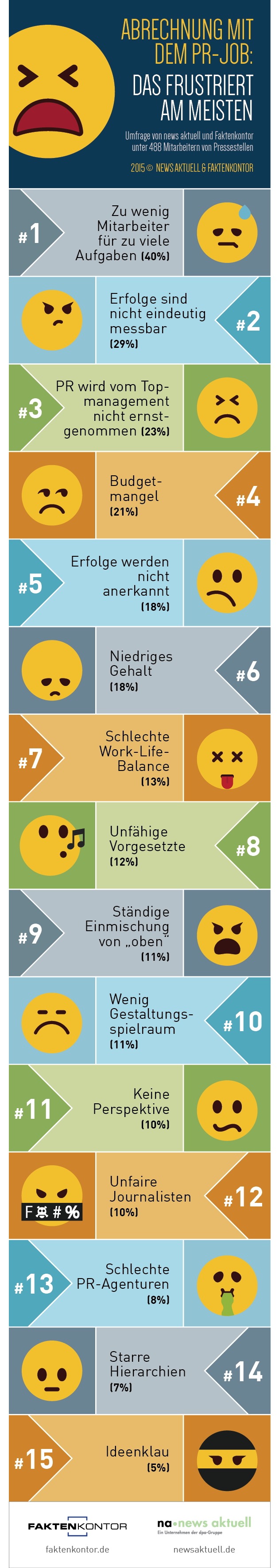 Die Umfrageergebnisse im Detail: 1. Zu wenig Mitarbeiter für zu viele Aufgaben (40 Prozent) 2. Erfolge sind nicht eindeutig messbar (29 Prozent) 3. PR wird vom Top-Management nicht ernstgenommen (23 Prozent) 4. Budgetmangel (21 Prozent) 5. Erfolge werden nicht anerkannt (18 Prozent) 6. Niedriges Gehalt (18 Prozent) 7. Schlechte Work-Life-Balance (13 Prozent) 8. Unfähige Vorgesetzte (12 Prozent) 9. Ständige Einmischung von "oben" (11 Prozent) 10. Wenig Gestaltungsspielraum (11 Prozent) 11. Keine Perspektive (10 Prozent) 12. Unfaire Journalisten (10 Prozent) 13. Schlechte PR-Agenturen (8 Prozent) 14. Starre Hierarchien (7 Prozent) 15. Ideenklau (5 Prozent) Quelle: Social Media Trendmonitor 2015