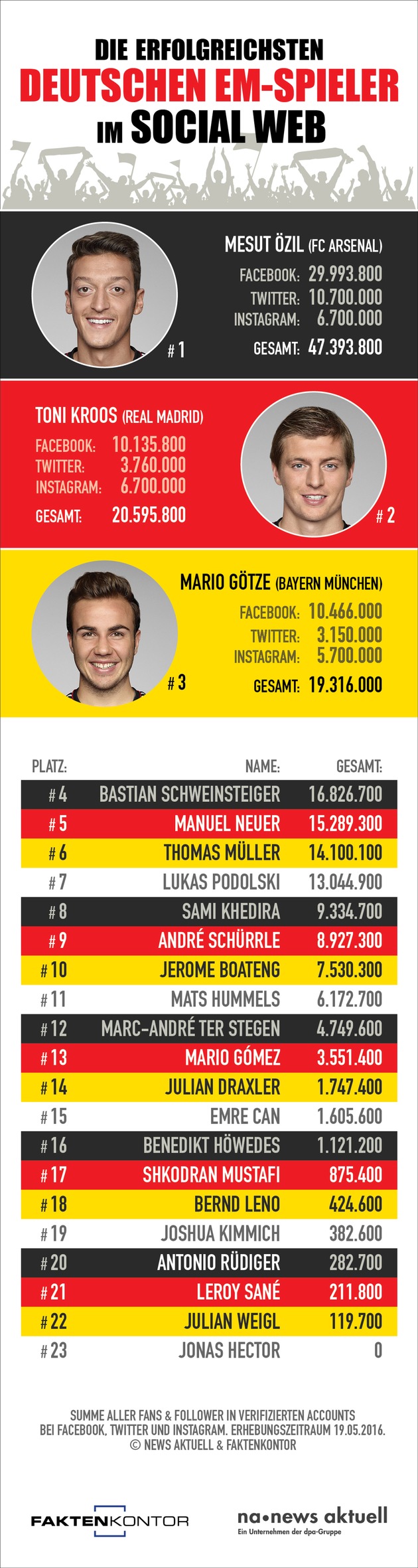 Das Social-Web-Ranking der deutschen EM-Spieler im Detail: 1. Mesut Özil: 47.393.800 (Gesamt) (Facebook: 29.993.800; Twitter: 10.700.000; Instagram: 6.700.000) 2. Toni Kroos: 20.595.800 (Gesamt) (Facebook: 10.135.800; Twitter: 3.760.000; Instagram: 6.700.000) 3. Mario Götze: 19.316.000 (Gesamt) (Facebook: 10.466.000; Twitter: 3.150.000; Instagram: 5.700.000) Weitere Plätze (Gesamtzahl der Follower auf Facebook, Twitter und Instagram): 4. Bastian Schweinsteiger: 16.826.700 5. Manuel Neuer: 15.289.300 6. Thomas Müller: 14.100.100 7. Lukas Podolski: 13.044.900 8. Sami Khedira: 9.334.700 9. André Schürrle: 8.927.300 10. Jerome Boateng: 7.530.300 11. Mats Hummels: 6.172.700 12. Marc-André ter Stegen: 4.749.600 13. Mario Gómez: 3.551.400 14. Julian Draxler: 1.747.400 15. Emre Can: 1.605.600 16. Benedikt Höwedes: 1.121.200 17. Shkodran Mustafi: 875.400 18. Bernd Leno: 424.600 19. Joshua Kimmich: 382.600 20. Antonio Rüdiger: 282.700 21. Leroy Sané: 211.800 22. Julian Weigl: 119.700 23. Jonas Hector: 0