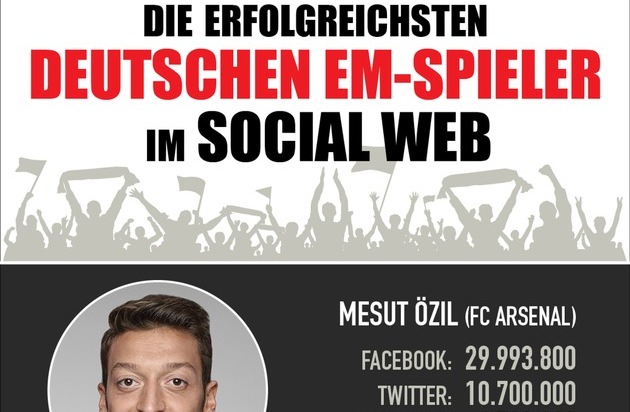 Das Social-Web-Ranking der deutschen EM-Spieler im Detail: 1. Mesut Özil: 47.393.800 (Gesamt) (Facebook: 29.993.800; Twitter: 10.700.000; Instagram: 6.700.000) 2. Toni Kroos: 20.595.800 (Gesamt) (Facebook: 10.135.800; Twitter: 3.760.000; Instagram: 6.700.000) 3. Mario Götze: 19.316.000 (Gesamt) (Facebook: 10.466.000; Twitter: 3.150.000; Instagram: 5.700.000) Weitere Plätze (Gesamtzahl der Follower auf Facebook, Twitter und Instagram): 4. Bastian Schweinsteiger: 16.826.700 5. Manuel Neuer: 15.289.300 6. Thomas Müller: 14.100.100 7. Lukas Podolski: 13.044.900 8. Sami Khedira: 9.334.700 9. André Schürrle: 8.927.300 10. Jerome Boateng: 7.530.300 11. Mats Hummels: 6.172.700 12. Marc-André ter Stegen: 4.749.600 13. Mario Gómez: 3.551.400 14. Julian Draxler: 1.747.400 15. Emre Can: 1.605.600 16. Benedikt Höwedes: 1.121.200 17. Shkodran Mustafi: 875.400 18. Bernd Leno: 424.600 19. Joshua Kimmich: 382.600 20. Antonio Rüdiger: 282.700 21. Leroy Sané: 211.800 22. Julian Weigl: 119.700 23. Jonas Hector: 0