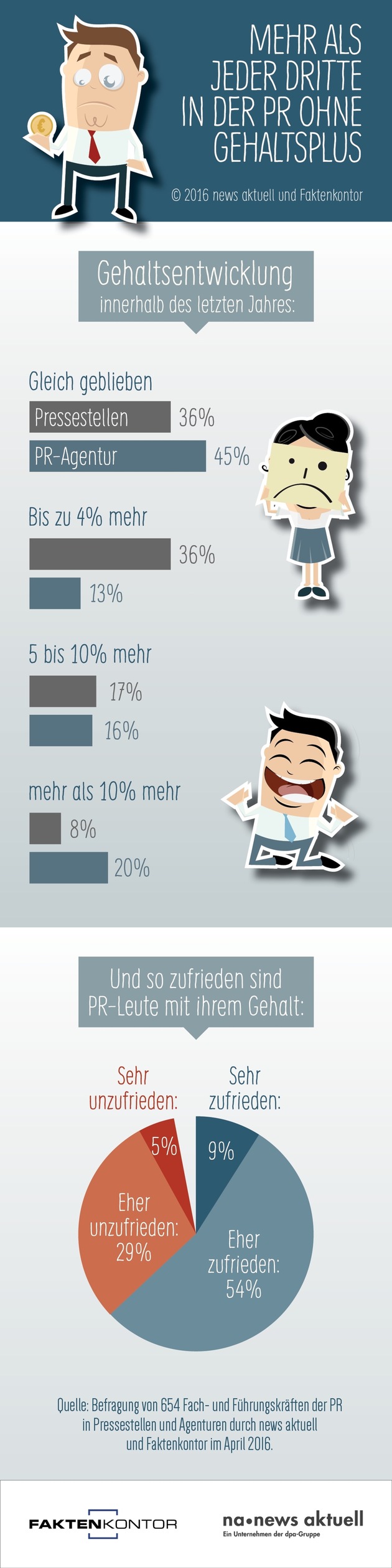 Viele PR-Profis mussten im Verlauf des letzten Jahres ohne Gehaltserhöhung auskommen. Gut ein Drittel der Beschäftigten in Pressestellen (36 Prozent) und fast jeder zweite in PR-Agenturen (45 Prozent) findet heute den gleichen Betrag auf dem Konto wie bereits zwölf Monate zuvor. Das ergab der PR-Trendmonitor von news aktuell und Faktenkontor, an dem 650 Fach- und Führungskräfte teilgenommen haben. Weitere Ergebnisse der Umfrage: Nur jeder zehnte PR-Profi ist mit seinem Gehalt "sehr zufrieden". Jeder zweite Kommunikationsexperte wird erfolgsabhängig bezahlt.