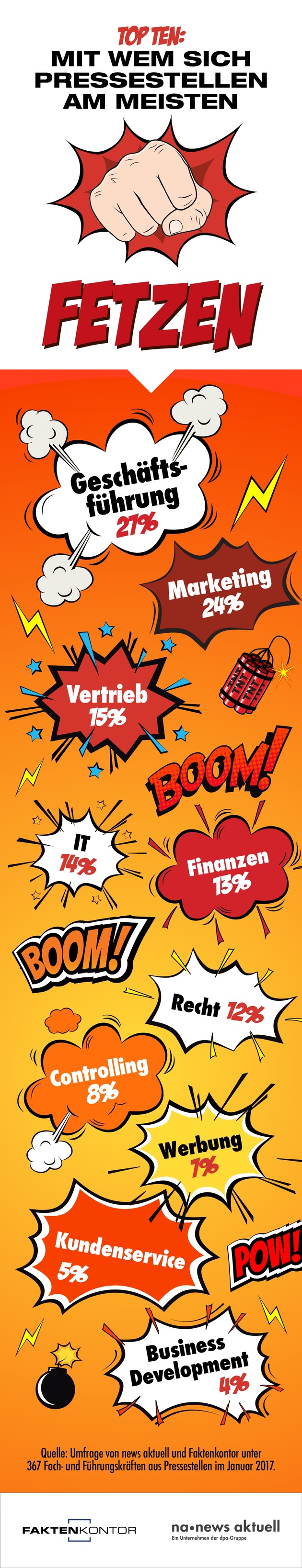 Die meisten Dispute führen Pressesprecher mit der Geschäftsführung. Nur wenig seltener gibt es Knatsch mit den Kolleginnen und Kollegen aus der Marketing-Abteilung. Auf Platz drei der internen Konflikt-Partner landen die Vertriebler. Das ergab eine Umfrage von news aktuell und Faktenkontor. Die dpa-Tochter hat bei Fach- und Führungskräften der PR nachgefragt, mit welchen Abteilungen sie die meisten Auseinandersetzungen haben. Knapp 370 Kommunikationsprofis haben am PR-Trendmonitor teilgenommen.