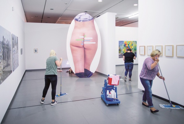 1. Platz: Rolf Vennenbernd Die Ausstellung - Reinigungskräfte putzen im Juni in Düsseldorf eine Ausstellung, zu dem auch das Werk "Text Butt" (2015) des in New York lebenden Schweizer Künstlers Olaf Breuning gehört.