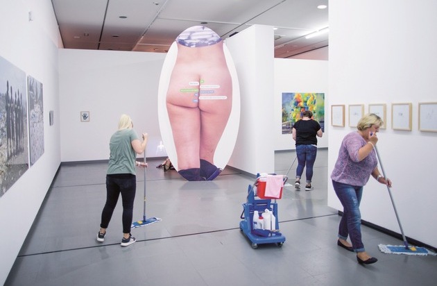 1. Platz: Rolf Vennenbernd Die Ausstellung - Reinigungskräfte putzen im Juni in Düsseldorf eine Ausstellung, zu dem auch das Werk "Text Butt" (2015) des in New York lebenden Schweizer Künstlers Olaf Breuning gehört.