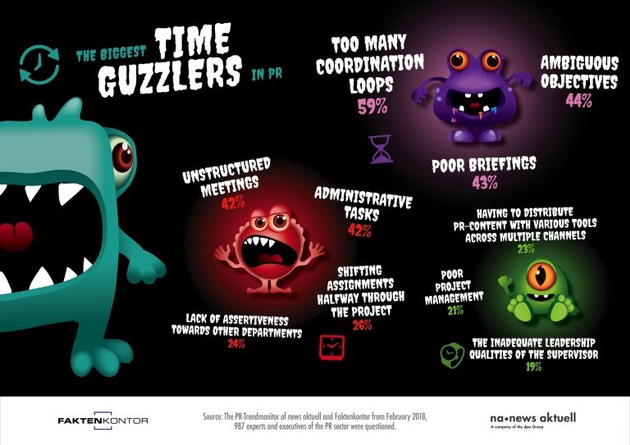 1. Too many coordination loops 59% 2. Ambiguous objectives 44% 3. Poor briefings 43% 4. Unstructured meetings 42% 5. Administrative tasks 42% 6. Shifting assignments halfway through the project 26% 7. Lack of assertiveness towards other departments 24% 8. Having to distribute PR-content with various tools across multiple channels 23% 9. Poor project management 21% 10. Inadequate leadership qualities of the supervisor 19% Source: PR-Trendmonitor 2018 Data pool: 987 specialists and executives from press offices Method: Online survey, multiple answers possible Survey period: February 2017 Initiators of the survey: www.newsaktuell.de www.faktenkontor.de