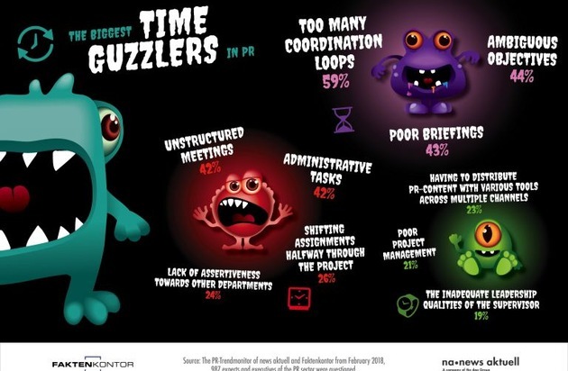 1. Too many coordination loops 59% 2. Ambiguous objectives 44% 3. Poor briefings 43% 4. Unstructured meetings 42% 5. Administrative tasks 42% 6. Shifting assignments halfway through the project 26% 7. Lack of assertiveness towards other departments 24% 8. Having to distribute PR-content with various tools across multiple channels 23% 9. Poor project management 21% 10. Inadequate leadership qualities of the supervisor 19% Source: PR-Trendmonitor 2018 Data pool: 987 specialists and executives from press offices Method: Online survey, multiple answers possible Survey period: February 2017 Initiators of the survey: www.newsaktuell.de www.faktenkontor.de