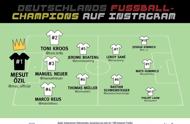 Demnach landen auf Platz vier Offensivspieler Marco Reus, auf Platz fünf Innenverteidiger Jerome Boateng und auf Platz sechs Angreifer Thomas Müller. Die letzten drei Plätze unter den Top 11 nehmen Innenverteidiger Mats Hummels (Platz neun), Außenverteidiger Joshua Kimmich (Platz zehn) und Fußballveteran Philipp Lahm ein (Platz elf). Weder der Account von Sami Khedira noch der von Mario Gómez schafften es unter die elf besten Instagram-Profile deutscher Kicker.