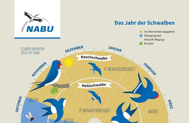 Der NABU zeigt mit einer kostenfrei nutzbaren Grafik auf www.NABU.de/schwalbenjahr, wie das Jahr der Schwalben aussieht. Die Grafik und Pressebilder gibt es unter: www.NABU.de/pressebilder_schwalben