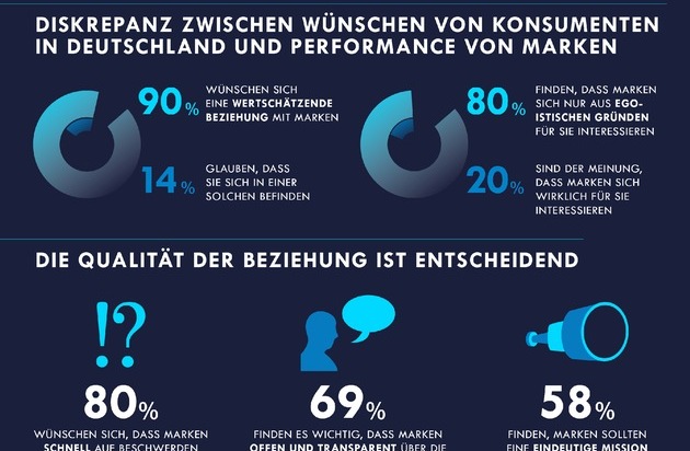 Zwischen den Bedürfnissen der Konsumenten und ihrer Wahrnehmung davon, was Marken tatsächlich bieten, klafft eine große Lücke, was auch dieses Ergebnis bestätigt: Nur 14 Prozent der Befragten sehen sich in einer Beziehung zu einer Marke, die von Wertschätzung geprägt ist. Dabei ist das Potential zu einer stärkeren Bindung zwischen Kunde und Marke durchaus vorhanden, denn neun von zehn Konsumenten in Deutschland wünschen sich eine solche. "Dafür reicht es nicht mehr aus, dem Kunden nur die technischen Möglichkeiten zum Gespräch zu bieten. Die Marke muss sich vor allem auch inhaltlich mit dem Feedback des Konsumenten auseinandersetzen, um tatsächlich in einen Dialog mit ihm treten zu können", sagt Behnke.