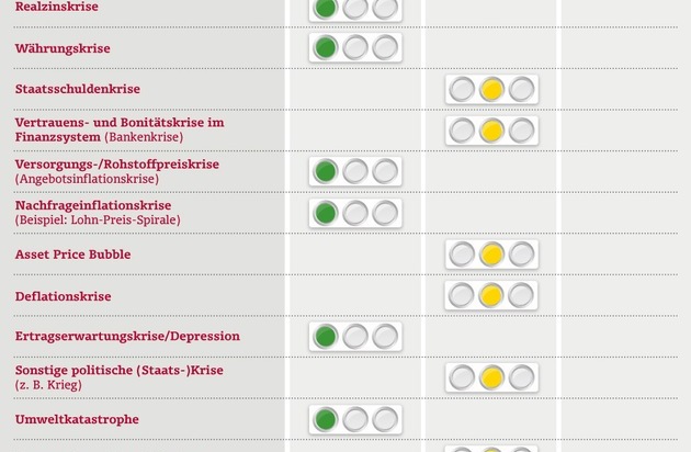 Die von quirin bank und FutureValue Group entwickelte Krisenampel ist ein Frühwarnsystem, um negative makroökonomische Auswirkungen auf die Kapitalanlage frühzeitig zu erkennen und rechtzeitig vermögenssichernde Maßnahmen für Anleger zu ergreifen. Neu ist dabei die Nutzung der wirtschaftshistorischen Erkenntnis, dass die in den letzten Jahrhunderten zu beobachtenden schweren Krisen auf eine überschaubare Anzahl von "Standardkrisentypen" zurückgeführt werden können. Diffuse Drohkulissen lassen sich so durch klar abzugrenzende Einzelkrisen systematisieren. Um eine Einschätzung über das Drohpotenzial der einzelnen Krisen für die Gesamtwirtschaft zu erhalten und die Wechselwirkung der Krisentypen für die Anlageentscheidung handhabbar zu machen, wird jedem Krisentyp im jeweiligen Betrachtungszeitpunkt eine Ampelfarbe zugeordnet. Dabei signalisiert "Rot" eine akute Krise, wogegen "Grün" für eine aktuell ungefährlich krisenfreie Situation steht. "Gelb" signalisiert eine mögliche drohende Krise und sollte in der Steuerung der Vermögensanlage als Signal für erhöhte Alarmbereitschaft und Vorbereitung auf eine bevorstehende Krise verstanden werden. Anlegern kann die Krisenampel dabei helfen, die Risiken besser zu erkennen und gemeinsam mit ihrem Honorarberater geeignete Strategien zur Bekämpfung möglicher Anlageverluste zu entwickeln. Die quirin bank veröffentlicht die Krisenampel vierteljährlich auf ihrer Website.
