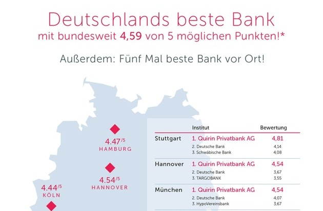 Und auch bei der regionalen Auswertung auf Städtebasis schneidet die Bank, die Anleger ausschließlich unabhängig gegen Honorar berät, hervorragend ab. In 9 der ausgewerteten Städte hat die Quirin Privatbank eine Niederlassung. Zur besten Bank vor Ort wurde sie - auch hier zum Teil mit deutlichem Vorsprung - in Stuttgart (mit 4,81 Punkten), Hannover (4,54), München (4,54), Hamburg (4,47) und Köln (4,44) gewählt.