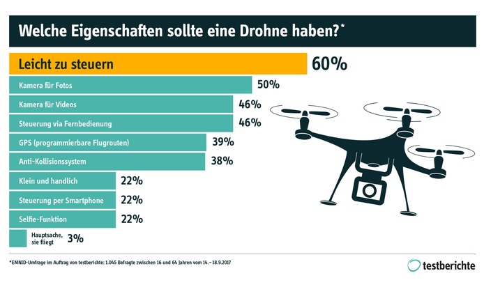 Die Zahl der privat und beruflich genutzten Multicopter, so genannte Drohnen, steigt stetig: Über 400.000 sind es mittlerweile in Deutschland. Doch was ist es genau, was viele Menschen an den ferngesteuerten bzw. autarken Luftfahrzeugen fasziniert? Das Marktforschungsinstitut Kantar EMNID hat im Auftrag von Testberichte.de (www.testberichte.de) untersucht, welche Eigenschaften sich die Deutschen bei der Nutzung einer Drohne besonders wünschen.
