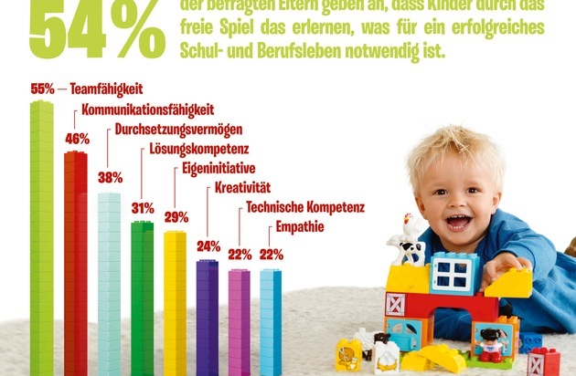 Mehr als die Hälfte der Eltern (54 %) sind der Meinung, dass Kinder durch das freie Spiel alles Notwendige für ein erfolgreiches Schul- und Berufsleben lernen. Das ist das Ergebnis einer aktuellen und repräsentativen Umfrage des Meinungsforschungsinstituts forsa im Auftrag der LEGO GmbH. Befragt wurden Mütter und Väter, die ein oder mehrere Kinder im Alter zwischen einem und fünf Jahren haben. Kommunikations- und Teamfähigkeit sowie Problemlösungskompetenz - drei Schlüsselkompetenzen der sogenannten "21st Century Skills" - sind laut Eltern für ihr Kind besonders wichtig, um den sich kontinuierlich wandelnden Anforderungen in der Zukunft gewachsen zu sein.