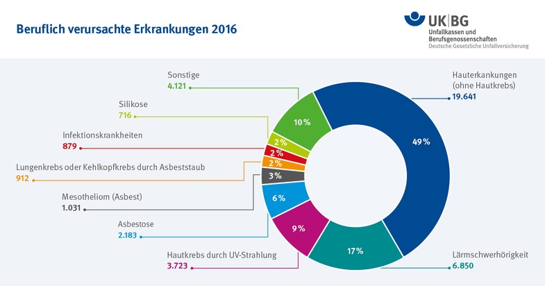 2016 registrierten Berufsgenossenschaften und Unfallkassen 75.491 Anzeigen auf Verdacht einer Berufskrankheit (-1,9 Prozent). Die Unfallversicherungsträger haben jedoch über das Jahr mehr Fälle bearbeitet als Anzeigen eingegangen sind: Insgesamt wurden 2016 80.029 Feststellungsverfahren abgeschlossen, 5,2 Prozent mehr als im Vorjahr. In 40.056 Fällen bestätigte* sich der Verdacht auf eine Berufskrankheit. Das ist ein Plus von 7,8 Prozent. In 5.365 Fällen wurde eine neue Rente bewilligt (+6,3 Prozent). In 20.539 aller Fälle wurde das Vorliegen einer Berufskrankheit anerkannt*. Das sind 22,2 Prozent mehr Anerkennungen als im Vorjahr. Einen wesentlichen Anteil an dieser Zunahme hat der weiße Hautkrebs durch UV-Strahlung, der seit dem 1.1. 2015 auf der Berufskrankheitenliste steht.