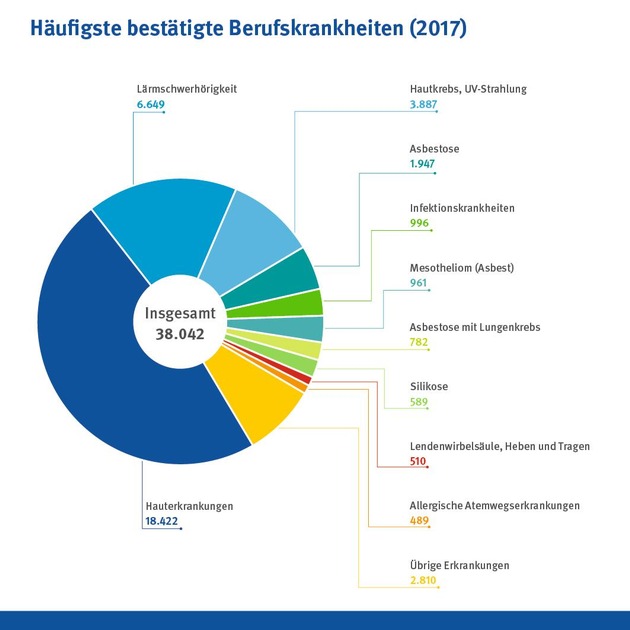 Berufskrankheiten: Fälle von hellem Hautkrebs nehmen zu Bei den häufigsten Berufskrankheiten waren die Zahlen im Vergleich zum Vorjahr zwar insgesamt leicht rückläufig. Die Gesamtzahl der Fälle, in denen sich der Verdacht auf eine Berufskrankheit bestätigte, sank um 4,9 Prozent auf 38.080. Davon betrafen rund 18.400 Fälle arbeitsbedingte Hautekzeme, zum Beispiel durch Feuchtarbeit (2016: 19.641). Bei 6.649 Versicherten stellten die Träger der gesetzlichen Unfallversicherung eine arbeitsbedingte Lärmschwerhörigkeit fest (2016: 6.850). Heller Hautkrebs, die dritthäufigste Berufskrankheit, war mit einem Anstieg um 165 Fälle allerdings die Ausnahme.