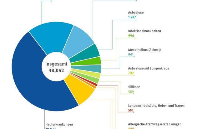 Nicht mehr der Prävention zugänglich ist dagegen die Gruppe der asbestbedingten Erkrankungen. "Hier sehen wir die Auswirkungen des leichtfertigen Umgangs mit diesem Gefahrstoff im vergangenen Jahrhundert", so Breuer. 2017 stellten Berufsgenossenschaften und Unfallkassen bei rund 3.700 Versicherten eine Erkrankung fest, die durch den beruflichen Kontakt mit Asbest ausgelöst wurde. Auch für die Mehrheit der 2.580 Todesfälle in Folge einer Berufskrankheit (2016: 2.573) war Asbest die Ursache.
