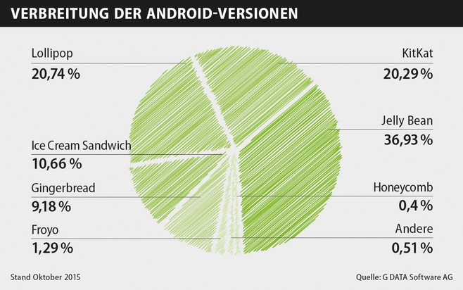 Im aktuellen Mobile Malware Report Q3/2015 haben die G DATA Sicherheitsexperten untersucht, welche Android-Versionen auf Smartphones und Tablets mit einer G DATA Sicherheitslösungen installiert ist. Über 80 Prozent nutzen veraltete Android-Versionen, die bereits bekannte Sicherheitslücken aufweisen. Lediglich rund 20 Prozent haben ein aktuelles Betriebssystem im Einsatz. Da die Statistik im Oktober 2015 erstellt wurde, fehlt das neue Android-6-Betriebssystem (Marshmallow).