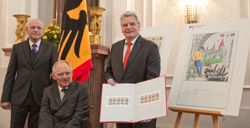 "Märchenhafte" Tradition im Berliner Schloss Bellevue: Bundesfinanzminister Wolfgang Schäuble übergab Bundespräsident Joachim Gauck als Schirmherr des Sozialwerkes die neuen Wohlfahrtsmarken mit Motiven aus "Dornröschen". Damit wird die im letzten Jahr mit "Hänsel und Gretel" gestartete Serie aus der Märchenwelt der Brüder Grimm fortgesetzt. Ein Album mit Erstdrucken der neuen Marken erhielt unter anderem BAGFW-Präsident Professor Dr. Rolf Rosenbrock (links).