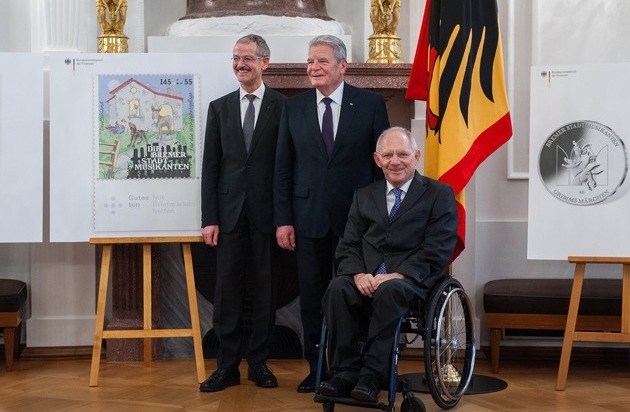 Eine gute Sache: Märchen auf Wohlfahrtsmarken! Bundespräsident Gauck war sichtlich angetan von den Motiven mit den Bremer Stadtmusikanten und versprach Bundesfinanzminister Schäuble (re.) und BAGFW-Präsident Neher (li.), Marken und Münze für seine Enkel und Urenkel zu kaufen. Damit unterstützt er als Schirmherr die soziale Arbeit von AWO, Caritas, Diakonie, DRK, Paritätischem und der Zentralwohlfahrtsstelle der Juden. Die Wohlfahrtsmarken gibt es ab dem 9. Februar bei der Post, den Wohlfahrtsverbänden und unter www.wohlfahrtsmarken.de