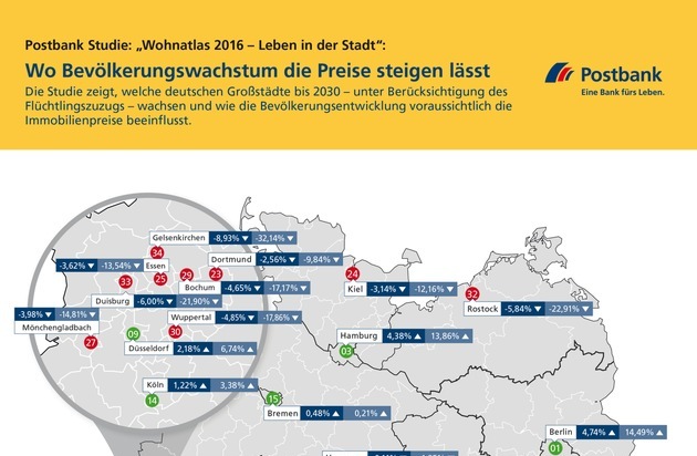 Postbank Studie "Wohnatlas 2016 - Leben in der Stadt": Wo Bevölkerungswachstum die Preise steigen lässt