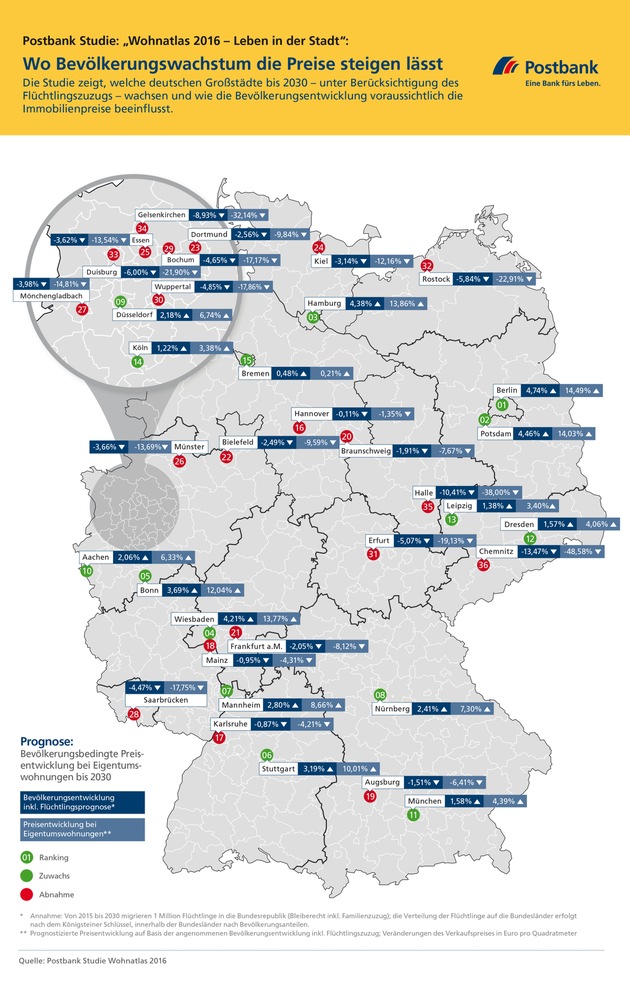 Die Postbank Studie "Wohnatlas 2016 - Leben in der Stadt" wurde unter der Leitung von Michael Bräuninger durchgeführt, Professor an der Helmut-Schmidt-Universität und Experte für Economic Trends Research. Analysiert wurden die 30 größten deutschen Städte sowie sechs Städte, die jeweils die größten eines Bundeslandes sind und nicht zu den Top 30 gehören. Im Fokus der beschriebenen Analyse standen die Bevölkerungsentwicklung unter Berücksichtigung des Zuzugs von Flüchtlingen, die Preisentwicklung von Wohneigentum und Mieten sowie die Entwicklung der Wohnflächennachfrage.