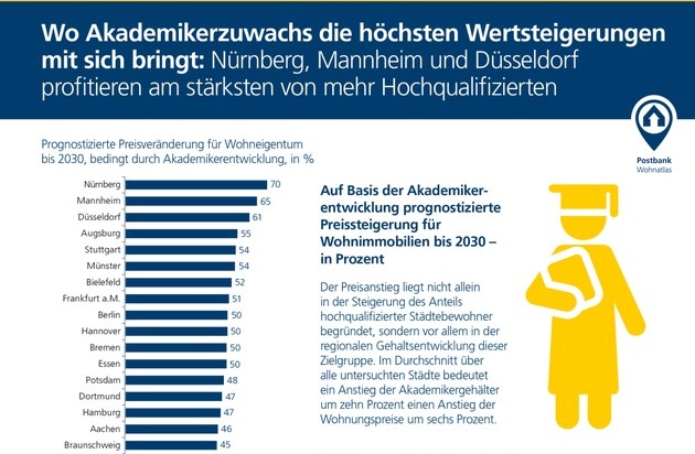 Der Anteil an beruflich hochqualifizierten Einwohnern einer Stadt hat starken Einfluss auf das Preisniveau für Wohneigentum. Die höchsten Wertsteigerungen durch den Zuzug von Akademikern werden in Nürnberg, Mannheim und Düsseldorf erwartet. In diesen Städten wird sich der Preis für 100 Quadratmeter Wohneigentum bis 2030 voraussichtlich um bis zu 70 Prozent verteuern. Der Grund: Hier werden sich die Einkommen von Arbeitnehmerinnen und Arbeitnehmern mit hoher beruflicher Qualifikation mehr als verdoppeln - was die Nachfrage nach attraktiven Eigentumswohnungen und damit auch die Preise in die Höhe treibt. Über fünfzigprozentige Wertsteigerungen durch den Zuzug von Hochqualifizierten sind auch in Augsburg, Stuttgart, Münster und Bielefeld zu erwarten. Dies sind Ergebnisse der Postbank Studie "Wohnatlas 2016 - Leben in der Stadt", für die die Immobilienmärkte in den 36 bundes- und landesweit größten Städten untersucht wurden.