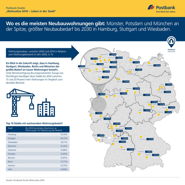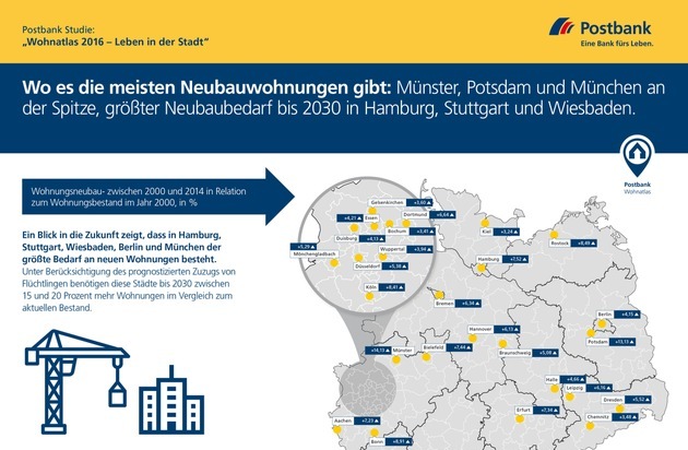 Die Postbank Studie "Wohnatlas 2016 - Leben in der Stadt" wurde unter der Leitung von Michael Bräuninger, Professor an der Helmut-Schmidt-Universität und Experte für Economic Trends Research, durchgeführt. Analysiert wurden die 30 größten deutschen Städte sowie sechs Städte, die jeweils die größten eines Bundeslandes sind und nicht zu den Top 30 gehören. Im Fokus der vorliegenden Analyse steht die Entwicklung des Wohnungsbestands sowie des Wohnungsbedarfs.