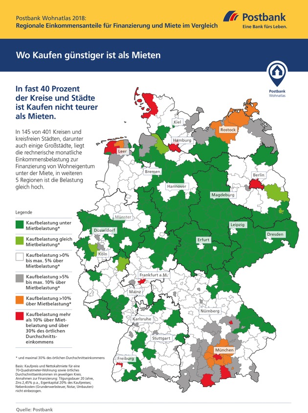 Postbank Wohnatlas 2018: Wo kaufen günstiger ist als mieten