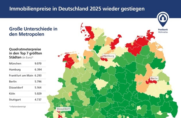 Nachdem die Immobilienpreise in Deutschland drei Jahre lang inflationsbereinigt gesunken sind, zogen sie 2025 wieder leicht an: Im Durchschnitt aller Landkreise und kreisfreien Städte stiegen die Preise für Eigentumswohnungen im Bestand gegenüber dem Vorjahr real, also nach Abzug der Inflationsrate von 2,2 Prozent, um 0,6 Prozent. Zum Vergleich: Im Jahr 2024 lagen die Preise real noch 2,8 Prozent, 2023 sogar 10,1 Prozent unter dem jeweiligen Vorjahresniveau. Dies sind zentrale Ergebnisse der Studie "Postbank Wohnatlas 2026". Im Auftrag der Postbank berechneten Expertinnen und Experten des Hamburgischen Weltwirtschaftsinstituts (HWWI), in welchen Regionen die Preise besonders stark gestiegen beziehungsweise gefallen sind und wie hoch der durchschnittliche Quadratmeterpreis im Jahr 2025 war.