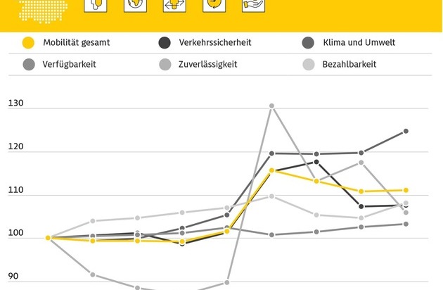 Dabei bewertet der Mobilitätsindex Nachhaltigkeit im Zeitverlauf sowie umfassend, indem neben Klima- und Umweltaspekten auch die Verkehrssicherheit, die Bezahlbarkeit, die Zuverlässigkeit und die Verfügbarkeit von Mobilität zugrunde gelegt und in einer aussagekräftigen Kennzahl zusammengefasst werden. Basisjahr ist mit der Kennzahl 100 das Jahr 2015.