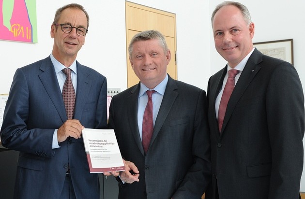 Am 4. September 2017 übergaben Dr. Michael P. Kuck, Vorstandsvorsitzender der NOWEDA Apothekergenossenschaft, und Dr. Christian Rotta, Geschäftsführer des Deutschen Apotheker Verlags (DAV), in Berlin das Gutachten "Versandverbot für verschreibungspflichtige Arzneimittel" an Bundesgesundheitsminister Hermann Gröhe (CDU). Das von Gesundheitsökonom Prof. Dr. Uwe May, Politikwissenschaftlerin Cosima Bauer und Rechtsanwalt Dr. Uwe Dettling erarbeitete Gutachten weist nach, dass nur ein Versandhandelsverbot für verschreibungspflichtige Arzneimittel (Rx) die flächendeckende, wohnortnahe Versorgung sichern kann.