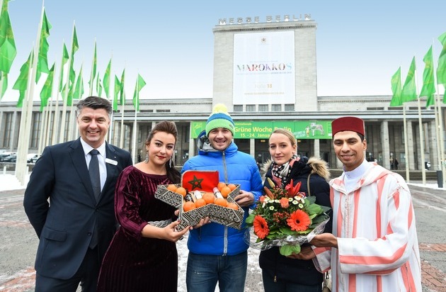 Der Landsberger Landwirt Johannes Geier ist der 100.000. Besucher der Internationalen Grünen Woche 2016. Der 32-Jährige ist extra aus Oberbayern für die Messe angereist, und weil es sein erster Besuch überhaupt ist, will er sich "überraschen lassen, was es hier alles gibt". Seine Begleiterin Julia Schwägerl, Bürokauffrau aus München, war dagegen schon öfter auf der Grünen Woche. Mindestens ein gemeinsames Interesse haben sie: "Ernährungsfragen, also auch einfach Essen und Bier." Aus dem Partnerland Marokko gab es einen Präsentkorb in Form des Sterns, der auch die Landesflagge schmückt. Er enthielt neben Mandarinen typisch marokkanische Essenzen, die zur Verfeinerung von Speisen ebenso wie von Kosmetik verwendet werden: Nussiges Arganöl, Orangenblütenwasser, Rosenwasser und Olivenöl.