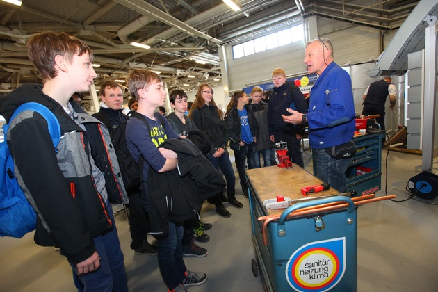 Larissa (15) von der Konrad-Duden-Schule in Berlin-Pankow ist Schülerscout. Im KarriereCenter Bau auf der bautec führt sie Schulklassen zu den Präsentationen der verschiedenen Akteure, die Jugendliche über Berufschancen in der Branche informieren und auch schon einmal praktisch üben lassen. Die von ihr betreuten Jungen und Mädchen der Otto-Unverdorben-Oberschule im brandenburgischen Dahme haben rund um den Arbeitstisch beim Förderverein Modul Platz genommen, um mit Feile, Bohrer, Schraubendreher und Hammer aus einer Metallplatte und einer Holzkugel einen Kerzenständer zu bauen. Gleich nebenan bescheinigt Feyzullah Yesilkaya vom Berliner Lehrbauhof der Fachgemeinschaft Bau Berlin-Brandenburg einer Klasse der Oberschule Schlieben beim Nagelklopfen handwerkliches Geschick. Während die Kameraden schon weiterziehen machen zwei Jungen noch einmal kehrt und wollen wissen, was ein Azubi im Baugewerbe verdient. Am Stand der SHK-Innung bastelt Klemptnermeister Andreas Jock mit Achtklässlern Trillerpfeifen aus Aluminium, Zink und Kupfer. Mit Wasser- und Abwasserrohren hat er nichts am Hut: "Wir heißen auch Spengler und sind zuständig für Fassaden- und Dachbleche", erläutert Jock. Mit einem nur noch zwei- bis dreiprozentigem Lehrlingsanteil sei man als Beruf fast am Aussterben und hofft dringend auf Nachwuchs. Für den wirbt ein Stück weiter die Dachdeckerinnung mit dem Spruch "Willst'ne geile Aussicht und fett Kohle verdienen?" Eine zweistündige Busfahrt haben 40 an handwerklichen Berufen interessierte Sieben- bis Elftklässler der Oberschule Glöwen aus der Prignitz auf sich genommen. Sie zieht es zuerst zur Bühne, auf der die Schülerband der Reinickendorfer Gustav-Freytag-Oberschule rockt, bevor es Vorträge und Präsentationen gibt. Am Stand der Agentur für Arbeit stellt sich nicht nur die Berufsberatung vor, sondern auch der Arbeitgeberservice als Ansprechpartner für Firmen, die Ausbildungsplätze schaffen wollen. Gegen Vorlage eines Schüler- oder Studentenausweises ist der Eintritt zur bautec mit dem KarriereCenter Bau frei.