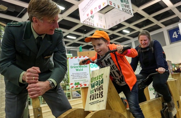 Neben der großen hölzernen Kugelbahn begeistert die Aktion "Grüne Woche-Wald". Hier können sich die Besucher aktiv einbringen und damit neue Baumpflanzungen ermöglichen. Auf der diesjährigen Messe hatten engagierte Besucher kräftig in die Pedalen getreten und auf dem "Waldpflegetandem" genau 5.702 Bäume für den Grüne Woche-Wald erradelt. Am nordöstlichen Stadtrand Berlins auf Flächen des Forstamtes Pankow erfolgte im Frühjahr die erste Pflanzung mit jungen Eichen, Hainbuchen, Linden und Kirschbäumen. Anlässlich des 1. Deutschen Waldtages im Oktober erfolgte eine Aufforstungsaktion auf dem Gelände des ehemaligen Berliner Reifenwerks in Schmöckwitz in Berlin-Köpenick.. 850 Bäume wie Kiefer, Winterlinde, Traubeneiche, Sandbirke und Feldahorn gelangten in den Boden der Industriebrache. Damit legen die Beteiligten symbolisch den Grundstein für einen Klimawald in Berlin. Der Grüne Woche-Wald ist ein Gemeinschaftsprojekt der Deutschen Forstbranche und der Messe Berlin GmbH.