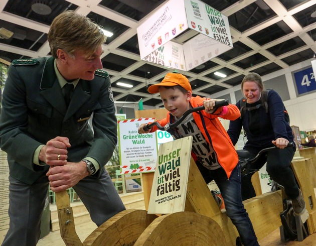 Neben der großen hölzernen Kugelbahn begeistert die Aktion "Grüne Woche-Wald". Hier können sich die Besucher aktiv einbringen und damit neue Baumpflanzungen ermöglichen. Auf der diesjährigen Messe hatten engagierte Besucher kräftig in die Pedalen getreten und auf dem "Waldpflegetandem" genau 5.702 Bäume für den Grüne Woche-Wald erradelt. Am nordöstlichen Stadtrand Berlins auf Flächen des Forstamtes Pankow erfolgte im Frühjahr die erste Pflanzung mit jungen Eichen, Hainbuchen, Linden und Kirschbäumen. Anlässlich des 1. Deutschen Waldtages im Oktober erfolgte eine Aufforstungsaktion auf dem Gelände des ehemaligen Berliner Reifenwerks in Schmöckwitz in Berlin-Köpenick.. 850 Bäume wie Kiefer, Winterlinde, Traubeneiche, Sandbirke und Feldahorn gelangten in den Boden der Industriebrache. Damit legen die Beteiligten symbolisch den Grundstein für einen Klimawald in Berlin. Der Grüne Woche-Wald ist ein Gemeinschaftsprojekt der Deutschen Forstbranche und der Messe Berlin GmbH.