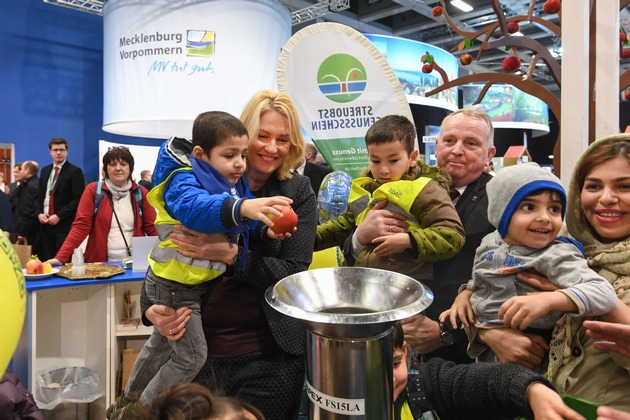 Gemeinsam besuchte die Delegation verschiedene Messestände und überzeugte sich von der Qualität made in Mecklenburg. Sie begegneten auch syrischen Flüchtlingskindern, die seit einiger Zeit im ICC Berlin wohnen und einen Ausflug auf die Grüne Woche machten. "Für unser Überleben ist es wichtig die Natur zu schätzen. Das können wir aber nur, wenn wir wissen, dass die Kühe nicht lila sind und wie der Apfelsaft in die Flasche kommt. Auf der Grünen Woche kann man das erfahren", sagte die Bundesfamilienministerin.