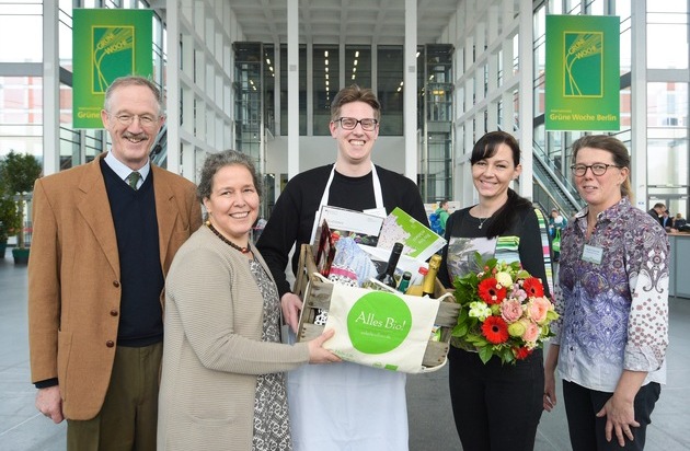 "Natürlich komme ich in erster Linie wegen der Blumenhalle", sagt Claudia Hoffmann strahlend mit einem Blumenstrauß in der Hand. Sie ist die 200.000. Besucherin der Internationalen Grünen Woche 2018. Zwar arbeitet sie jetzt als zahnmedizinische Fachangestellte, aber "in meinem ersten Beruf bin ich Floristin." Der Blumenstrauß sei sehr schön, durfte sich dann auch die Messegesellschaft über professionelles Lob freuen. Und ja, natürlich komme sie auch wegen des Essens, gibt sie zu. Freudig stellte sie sich den Fotografen mit Felix Prinz zu Löwenstein, dem Vorsitzenden des Bundes Ökologische Lebensmittelwirtschaft. Schließlich nahm sie die Präsentkiste des Bundesprogramms Ökologischer Landbau (BÖLN) entgegen, die Brot von der Hofpfisterei, Dinkelnudeln, einen Rotwein namens "Chefsache", einen roten Sekt, aber auch Bier, Kalaharisalz und Tomatensaft enthielt. Zum Lesen gab es einen Führer für ökologische Camper-Stellplätze und die neueste Ausgabe des Bio-Magazins "BioErleben" dazu.