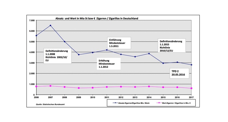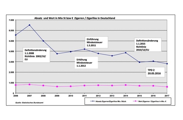 Das Statistische Bundesamt hat mit seiner heutigen Pressemeldung über den Absatz von Tabakwaren im Kalenderjahr 2017 berichtet. Für Zigarren und Zigarillos wird ein Rückgang von 7,4 Prozent und ein Volumen von 2,823 Mrd Stück nach 3,049 Mrd. Stück im Vorjahr ausgewiesen. Der Bundesverband der Zigarrenindustrie (BdZ), der die Interessen der mittelständisch strukturierten Hersteller, Importeure und Vertreiber von Zigarren und Zigarillos vertritt, betont, dass es sich bei diesen Zahlen nur um den Bezug von Steuerzeichen handelt, in denen auch die niedrigpreisigen ECO-Zigarillos enthalten sind. Dieses Marktsegment hat sich in den letzten Jahren stark rückläufig gezeigt, während sich der Absatz von traditionellen Zigarren und Zigarillos mit einem Marktvolumen von ca. 1,1 Mrd. Stück im zurückliegenden Kalenderjahr stabil entwickelt hat.