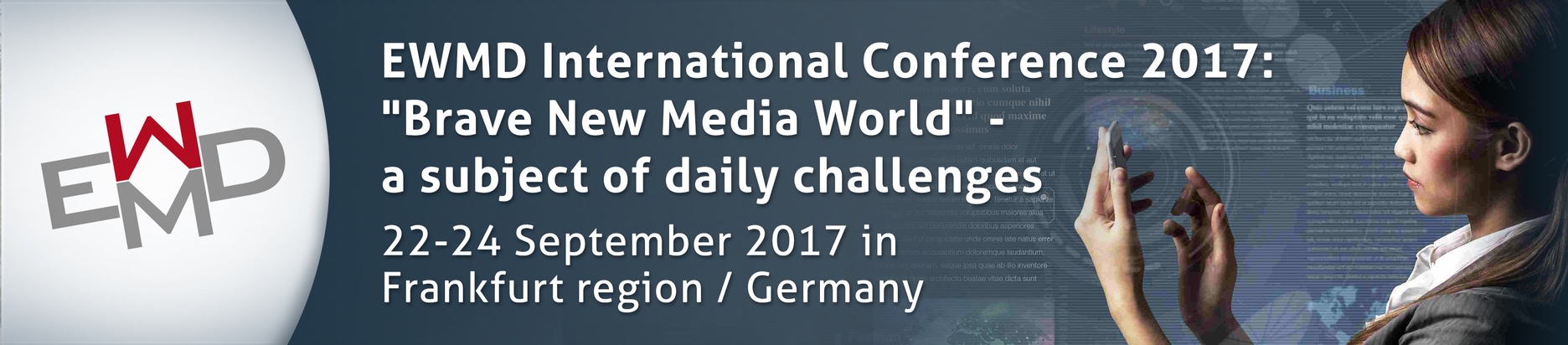 Wie verändert die Digitalisierung unsere Kommunikation und welchen Einfluss haben Medien im Zeitalter 4.0? Diesen Fragen stellt sich die diesjährige Internationale Konferenz des Frauen-Business-Netzwerks EWMD. Unter dem Motto "Brave New Media World" findet sie vom 22. - 24. September auf dem Firmengelände des forschenden Pharmaunternehmens Boehringer Ingelheim in Ingelheim statt.