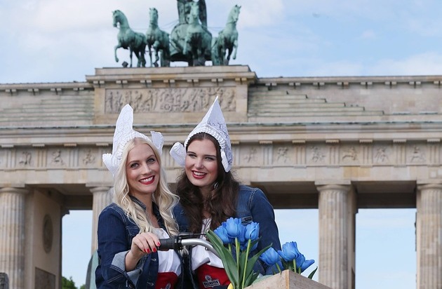 Frühling, Meisjes, Fahrräder, Tulpen und Käse - Holland grüßt Berlin. Fröhlich klingelnd brachten am heutigen Donnerstag, 7. Mai 2015, Kaily, Suzanne, Debbie, Eefje, Shauny und Kaley, sechs echte, holländische Käsemädchen, auf gelben Fahrrädern den ersten Käse des Jahres aus der frischen Frühlingsmilch Nordhollands, den Beemster Graskaas, nach Berlin. Da gab es vor dem Brandenburger Tor einen rundherum leckeren Anblick. Denn gerade die ersten, neuen Lebensmittel einer Saison sind immer etwas Besonderes, sie sind noch ganz frisch und zeugen von der Qualität des kommenden Jahrgangs - so wie der Beaujolais-Primeur oder der erste neue Matjes-Hering. Heute brachten Frau Antjes Schwestern dann also symbolisch den ersten Käse des Jahres aus Nordholland nach Deutschland. Dieses Jahr kam er zum Brandenburger Tor nach Berlin, letztes Jahr eröffneten die langhaarigen Meiden die Käse-Frühlingssaison am Kölner Dom. Destination der Kuriere im Spitzenhäubchen war die niederländische Botschaft, wo die Botschafterin des Königreichs der Niederlande, Monique van Daalen, den Erstlingskäse 2015 persönlich entgegennahm.