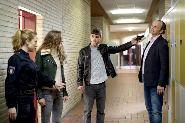 Seit 30 Jahren erzählt der ARD-Klassiker "Großstadtrevier" realitätsnah vom Polizeialltag auf dem Hamburger Kiez. In der 400.Folge am kommenden Montag, 22. Mai 2017, um 18:50 Uhr im Ersten informieren Daniel Schirmer (gespielt von Sven Fricke) und Nina Sieveking (Wanda Perdelwitz) bei einem Besuch in einer Hamburger Schule über den Beruf des Polizisten - und erleben nichts Alltägliches. Sie werden in der dramatischen Jubiläumsepisode "Hunde, die bellen" (Drehbuch: Georg Lippert, Regie: Torsten Wacker) mit einer Geiselnahme in der Schule konfrontiert.