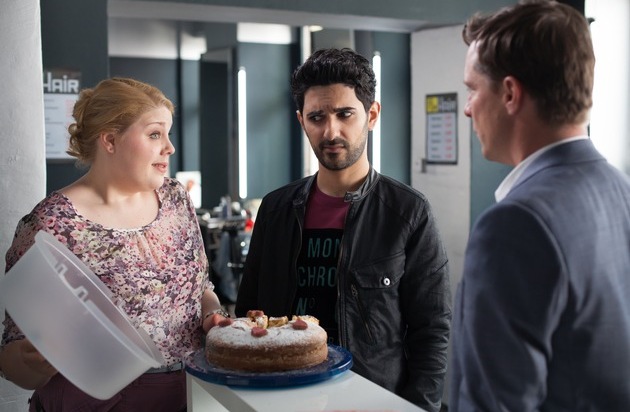 Mandy backt fuer ihr Leben gern. Aber dass ausgerechnet dieser Kuchen nicht für ihren besten Freund und Frisoerkollegen Karat (Reza Brojerdi, M.) ist, sondern fuer "Sonnenuntergang" (Florian Panzer), ihrer neuen Internet-Bekanntschaft, gefaellt Karat gar nicht Die neue SAT.1-Serie "Frauenherzen", am Dienstag, 15. September 2015, um 20:15 Uhr